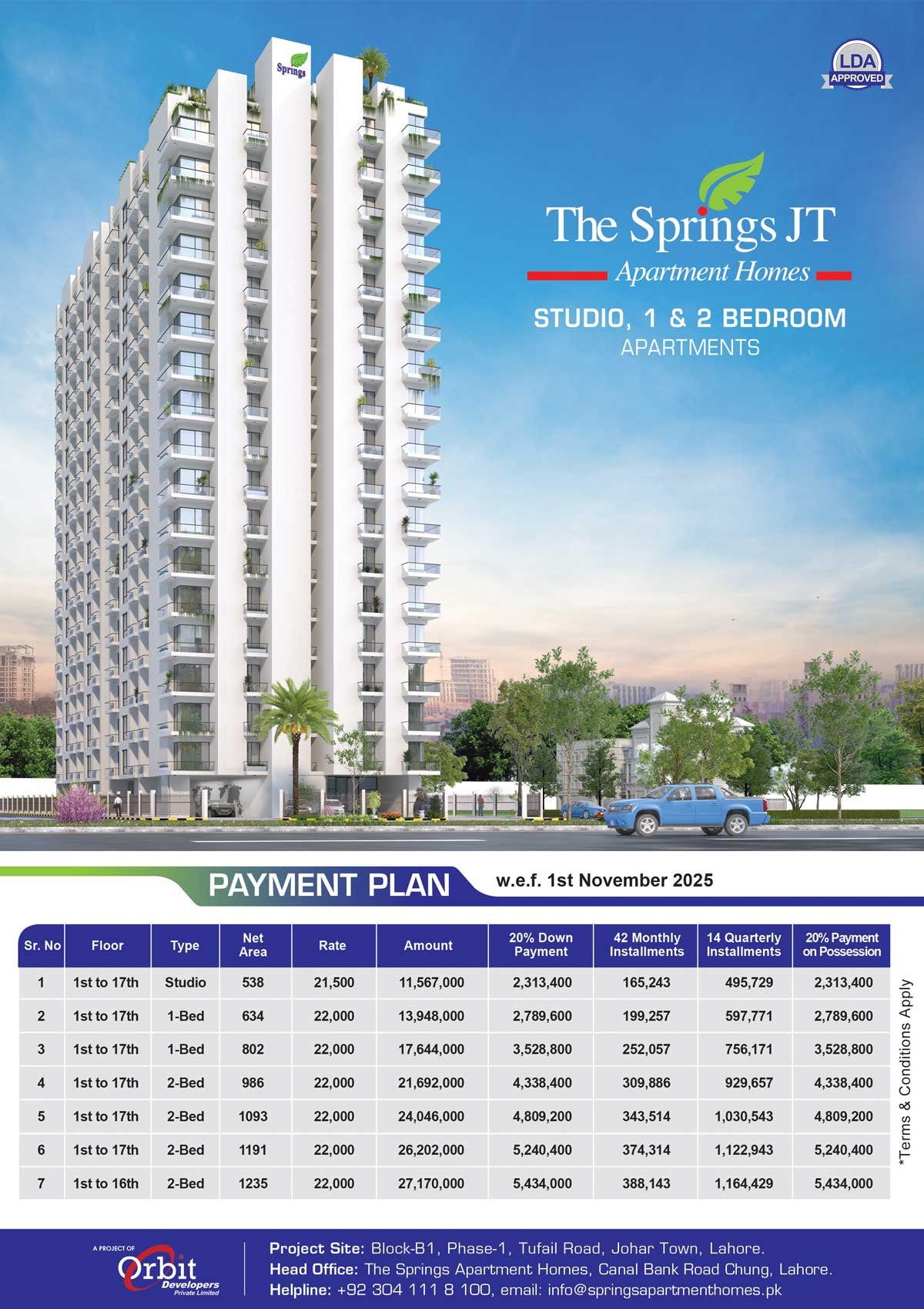 The Springs JT rises as a striking new landmark on Lahore’s skyline. This gated community consists of two Towers – blending contemporary architecture with thoughtfully planned apartments, created for small and growing families who value comfort, quality and convenience in a prime location.