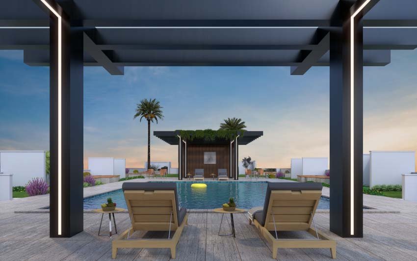 An elegant poolside deck crafted for leisure, sunbathing, and refined gatherings.