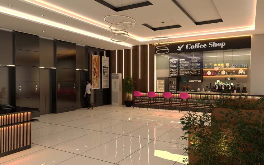 A stylish coffee shop on the ground floor welcomes you with a warm, upscale ambiance perfect for a quick break, informal meeting, or relaxed catch-up with friends and family.