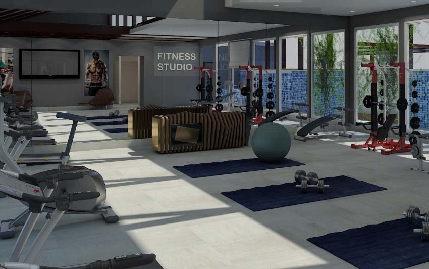 A fully equipped rooftop gym delivering a complete fitness experience above the city.